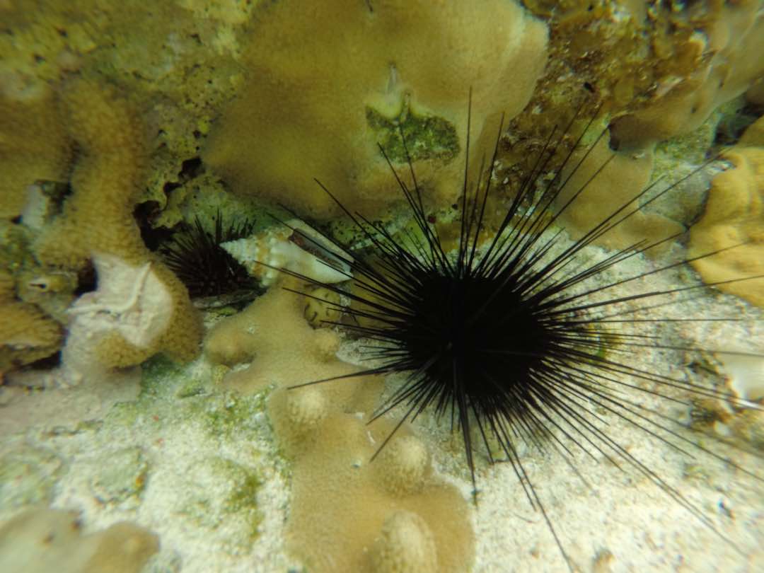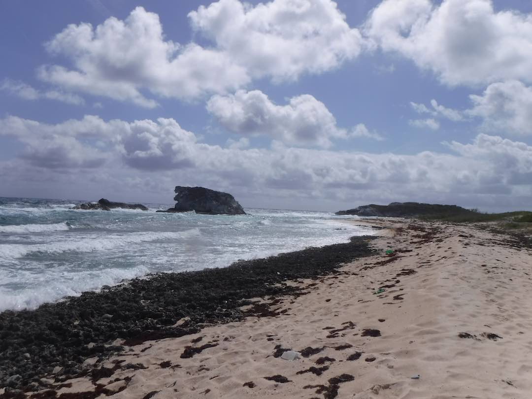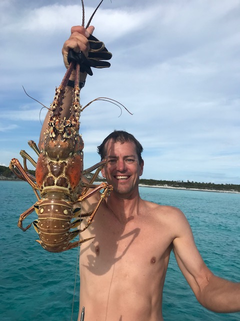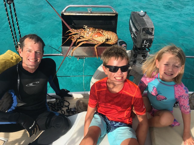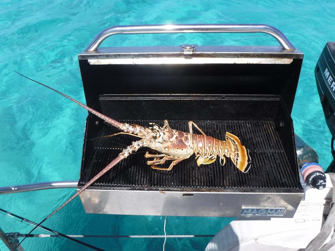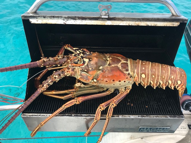 Monday was our day of rest. We anchored off a pretty beach and swam to shore. With wind calmer we pumped up the paddle board again. It’s been 2 days and we’ve still not used the gasoline-powered dinghy! Emma has come a long way in 3 months – she swam the entire way back from shore to Amel – about 1000feet, 0.2 miles or the equivalent of ~13 lengths in a swimming pool. No lifejacket, no wetsuit, no worries – just a mask and snorkle. Those pencil stick arms do have some good muscle in there! We found a nice coral head with TONS of fish on it. Very surprising considering it was just one small coral head with nothing else around. We also speared a lobster for lunch – now that was a treat!