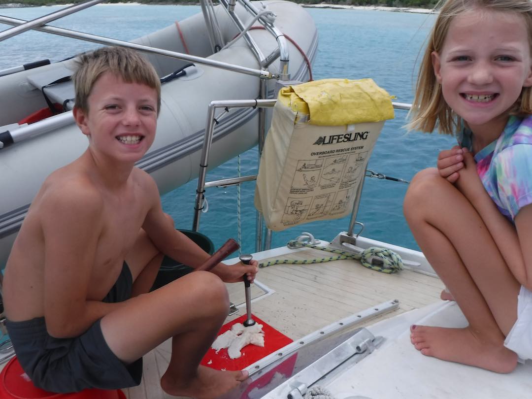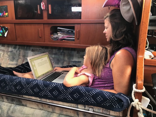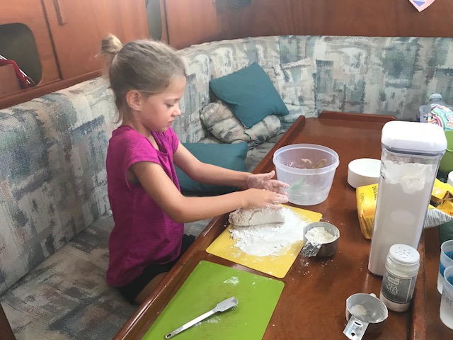 Daylight savings sure has hit us. I remember spring is always the toughest one to adjust to. But somehow, the clocks changed 1 hr – and our routine has changed 2-3hrs! Monday Henry slept in till 9:15am and today 8:30. Kids are usually up around 6:30-7am. We are enjoying the dinnertime/sunset adjustment. All winter it has been such a rush to try and get dinner made (which has me in the galley) but also enjoying the sunset around 5:30-6pm. It is lovely that it’s at 7:15pm now. So wonderful to have bedtime stories in the cockpit with the sky glowing all around us.