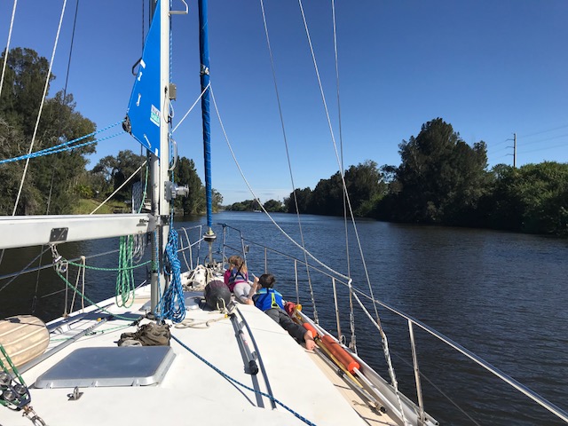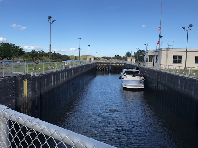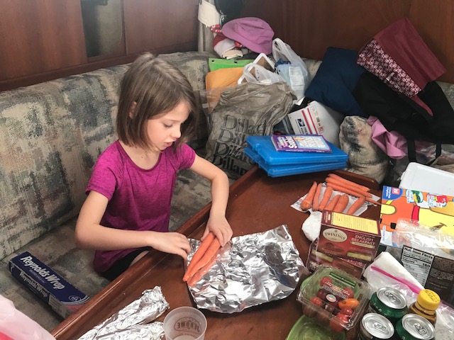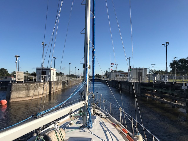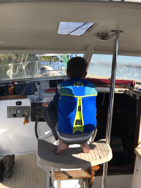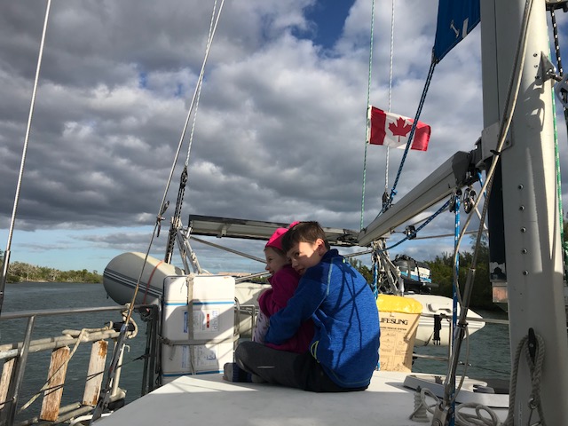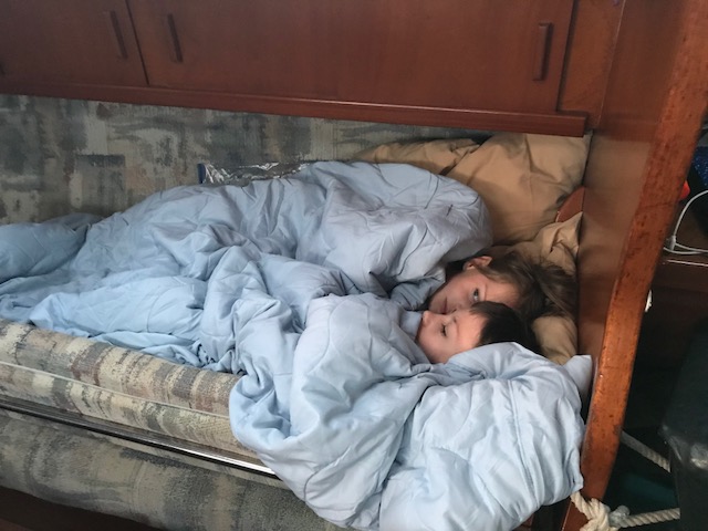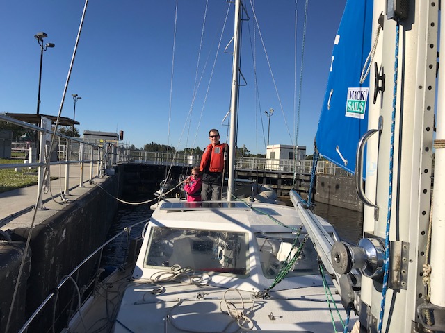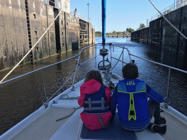 Henry and Emma maintained their sanity during all this and were great helpers to run all the bags from the car to the boat. They had fun “spying” on me as I dove upside down to store food in the fridge. Henry escorted Emma on trips to the bathroom (facilities are located on land – like a campground in a centralized area). They love running to the lock viewing platform whenever a boat is going through. Good local entertainment! It’s a 14 foot drop in water.