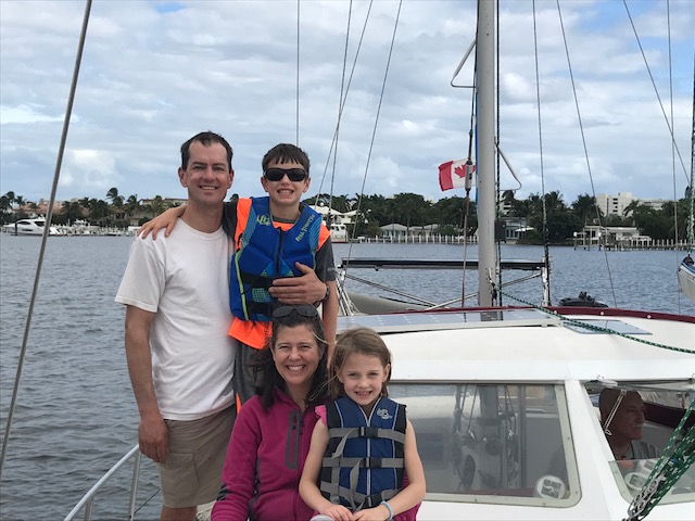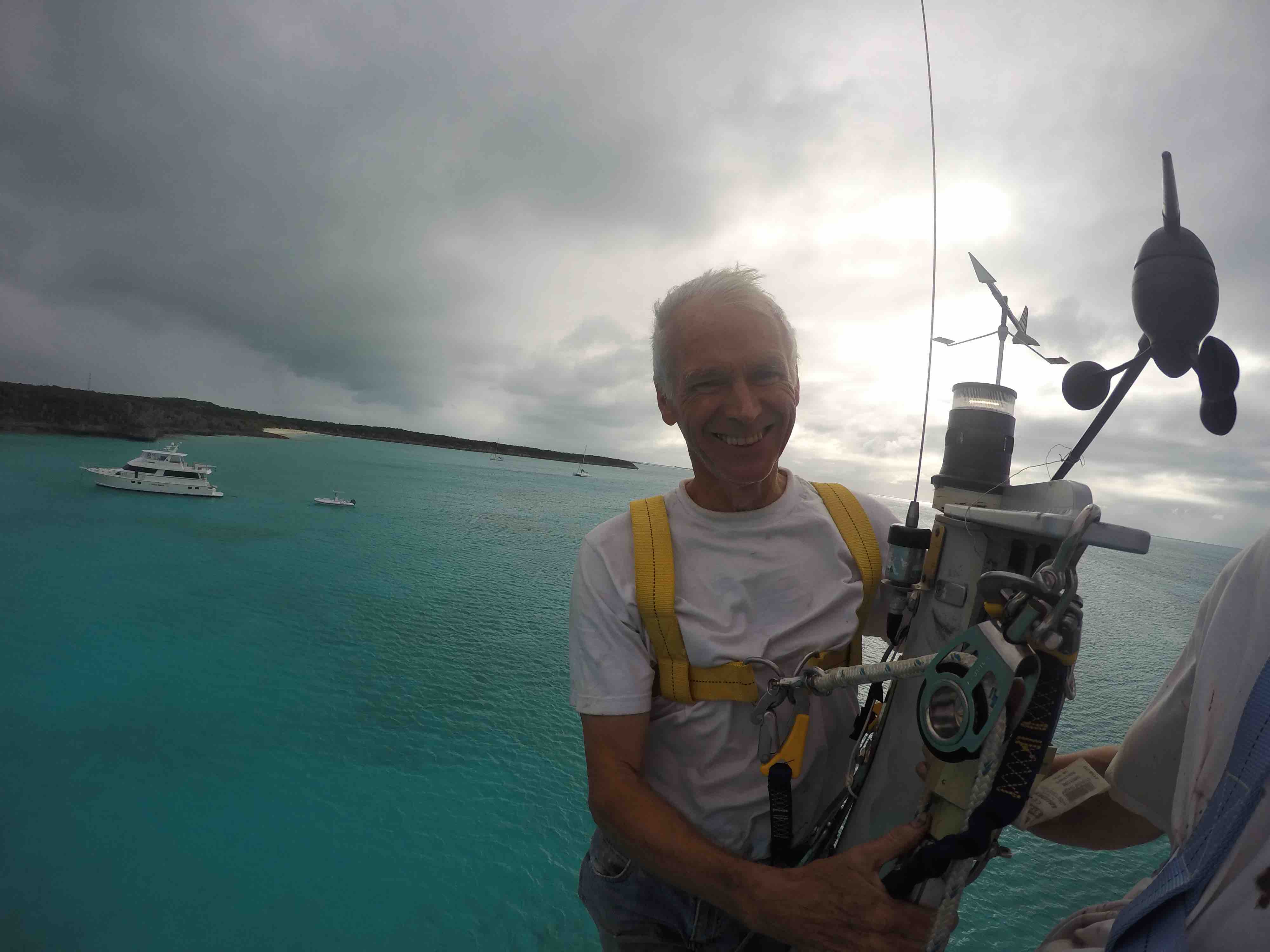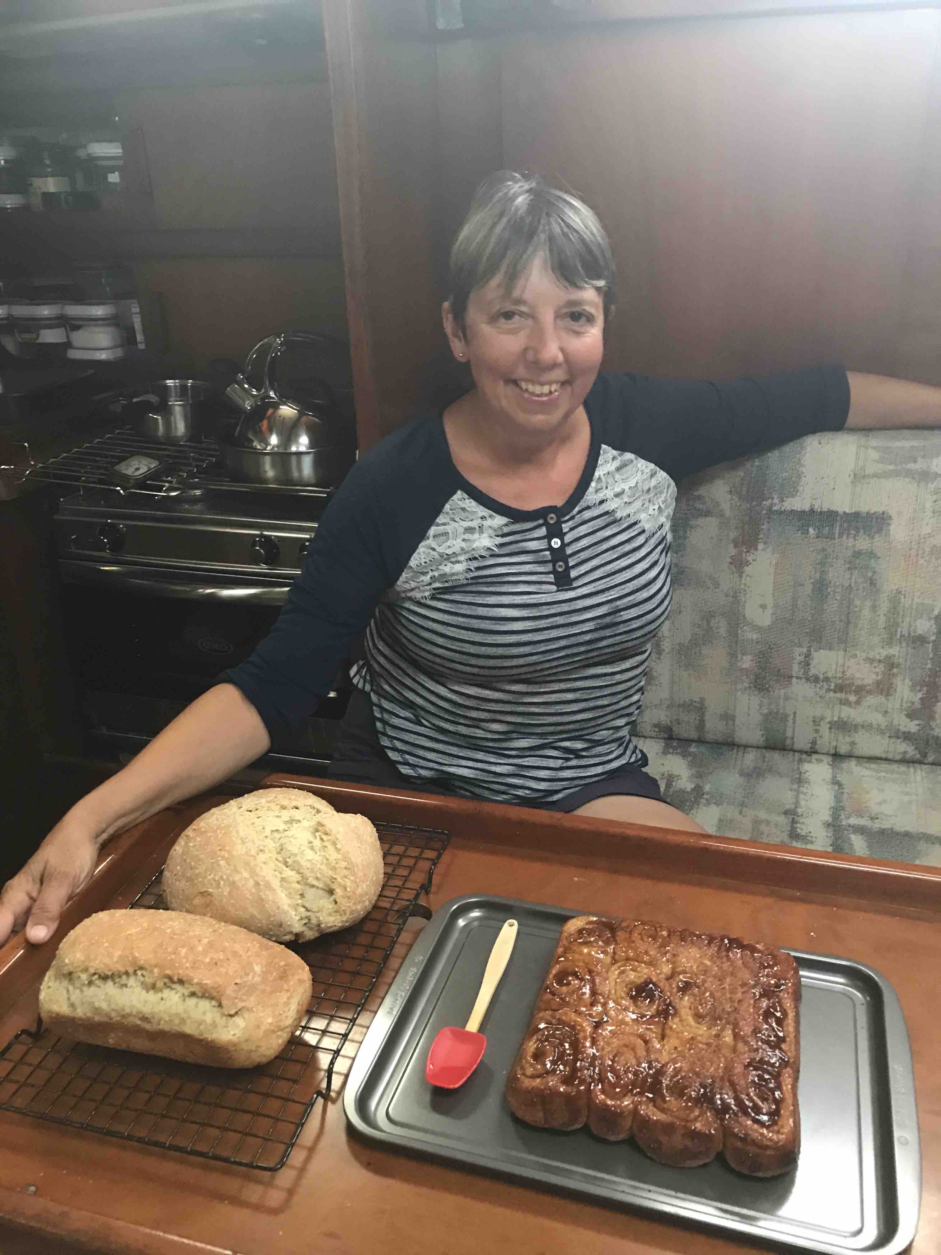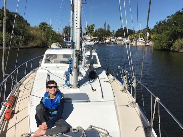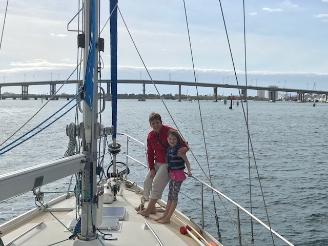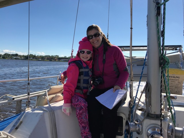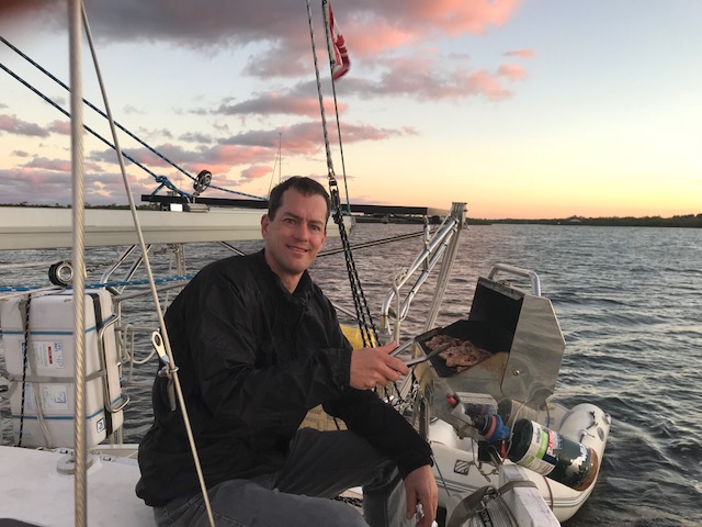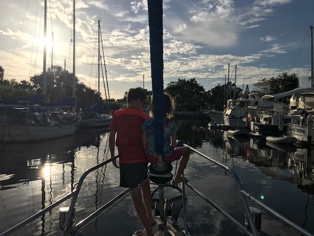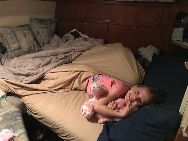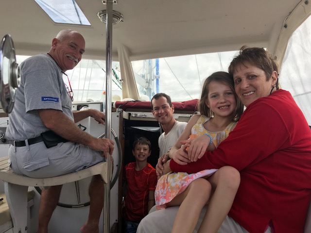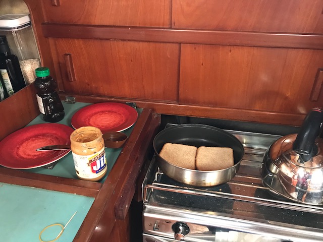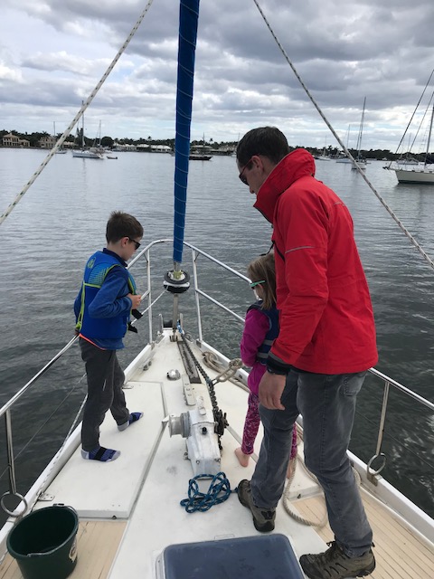 We had our next boat ‘learning event’ when Emma announced at 5:10pm she was hungry. No problem – I would get dinner on early. I had an easy dinner planned for our first night cooking on board. I knew how to start the stove…but it wouldn’t start. Hmmmm. I can figure this out…follow the path of lines to the propane tank area…..Ah yes….mike was currently off the boat filling all the propane tanks. ARGH!!! Called Mike – as it turns out there was one tank left on the boat. I just had to get it from the aft lazarette. Well – there were only about 30 bags of food between me and the aft lazarette – but no problem doing that – then navigating while carrying large tank back to cockpit, through bags, to hook up. And Voila…stove is working – 5:35. Where are the pans? Oh yes…first time they are used in 6 months…pans are dirty. No problem, I can clean the pans, start the water boiling for pasta, another pot for steamed broccoli and the third pot for the sausage…..oh wait. That’s right! Amel only has 2 burners….so….we eat dinner in shifts….sausage, then pasta followed by a Broccoli dessert!! Will get used to this…just need to re-set brain to new ways of cooking!
