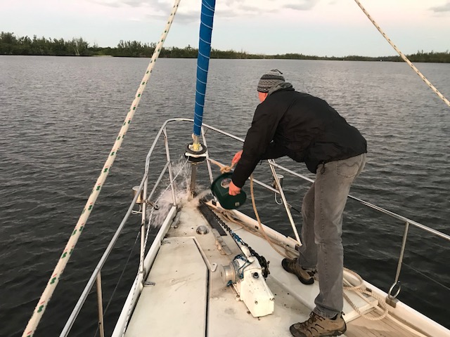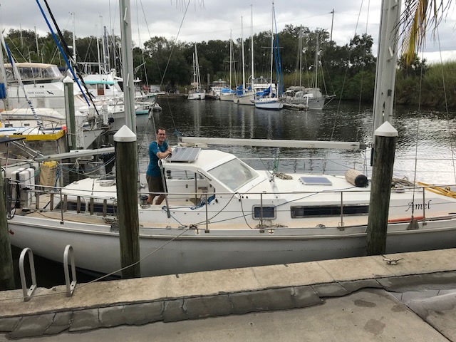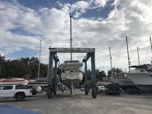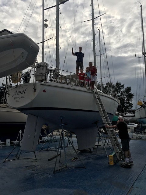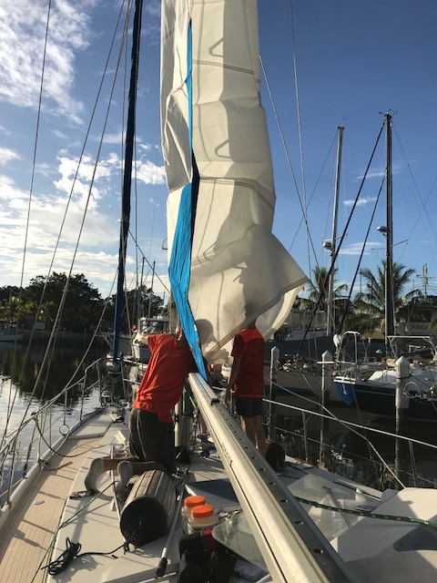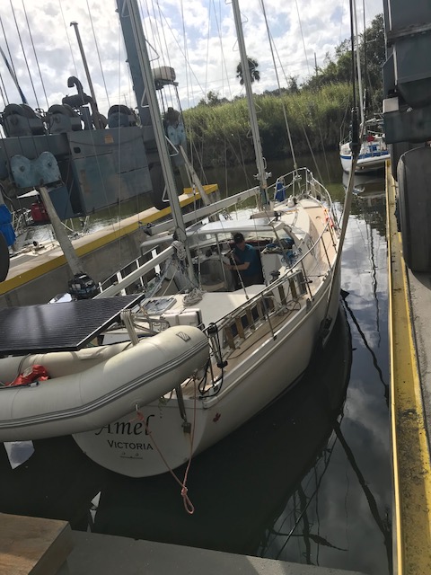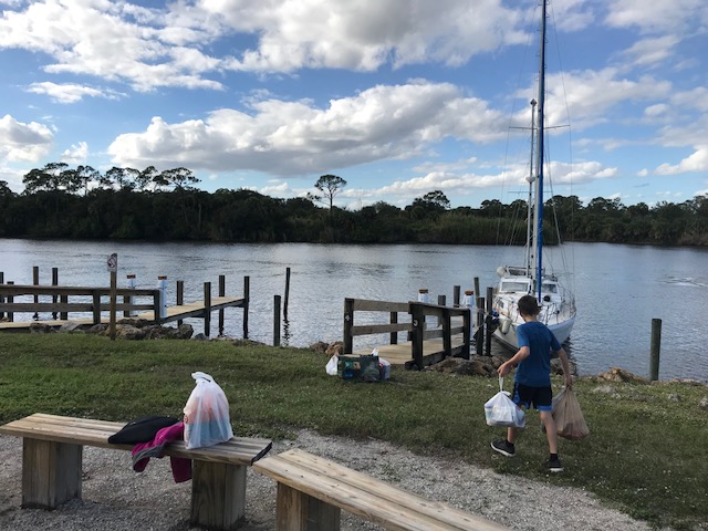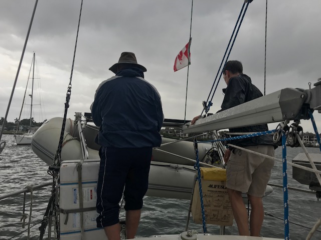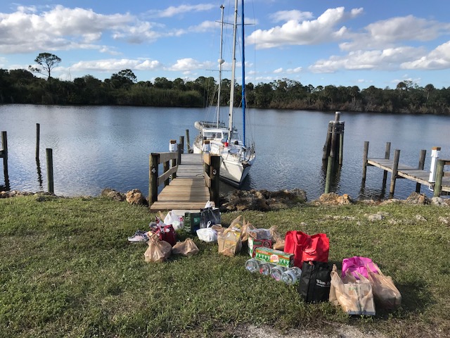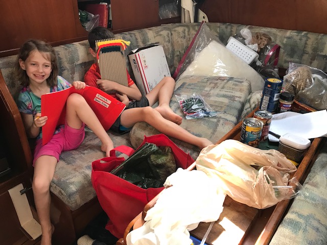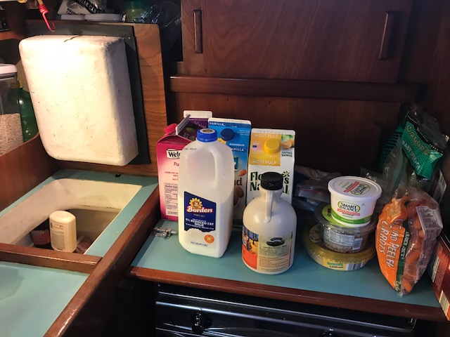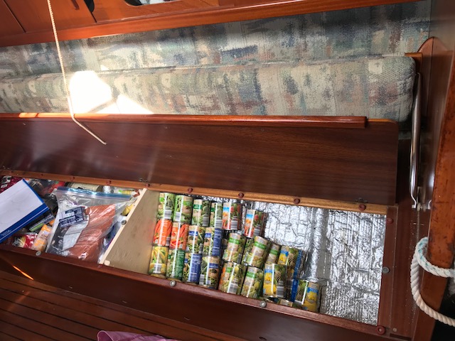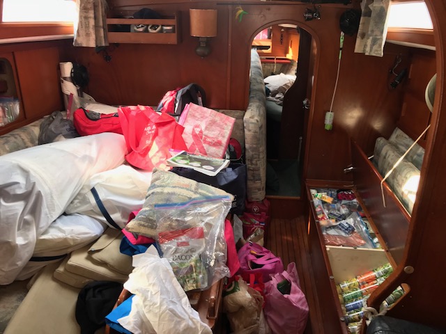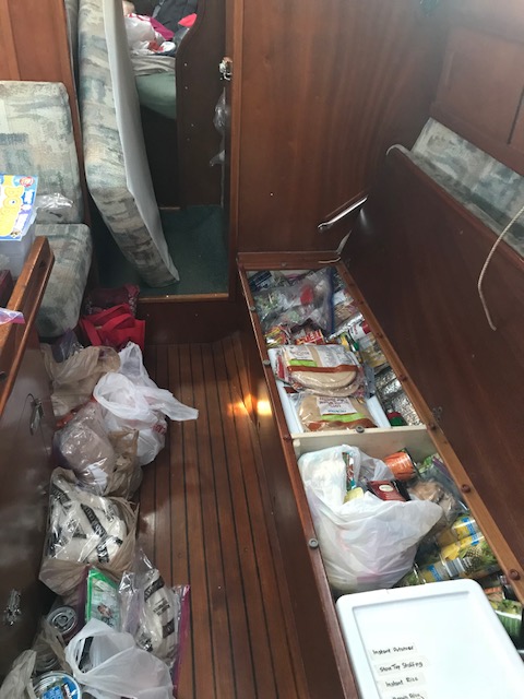 Felt good getting it all done…only to realize once we drove home that now we had to move, single bag by single bag, everything across the grass field to the boat, up the finger pier, onto the boat….and then it all had to be de-constructed (some cardboard again)…and then put into locations in the boat. Have I mentioned that boat’s do not have normal cupboards like a house. There are a few accessible areas to slide open a door and store some small items. However, to store 3 months of food, one has to do more work. There are odd shaped triangular cubbies, there are compartments underneath the settee (couch). To get to the compartment you have to remove all the cushions which are large and take up space, then lift up the lid to access the space to store food. Amel actually has some fabulous somewhat squarish type compartments. On Mandolin, I used to maintain a spreadsheet of the 39 various sized compartments to keep track of what food I had where. It can be quite the project.