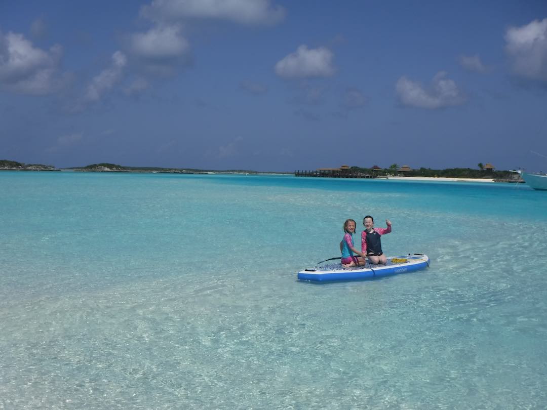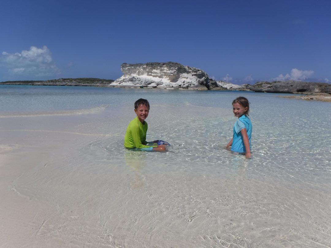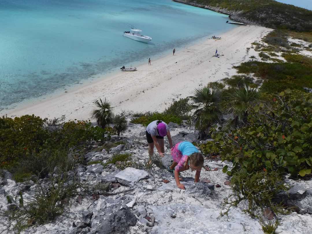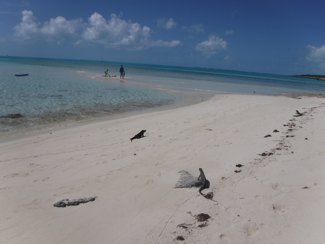 We explored the south side of Staniel Cay by dinghy, an area we’d never been to before. We found isolated beaches and good coral reefs for snorkeling near Staniel – even found another plane inhabited by fish in just a few feet of water. Back near Amel, we made it to shore under human power, with the boys swimming and the girls paddle boarding. We found a new beach also full of iguanas, this time under stunning white cliffs.