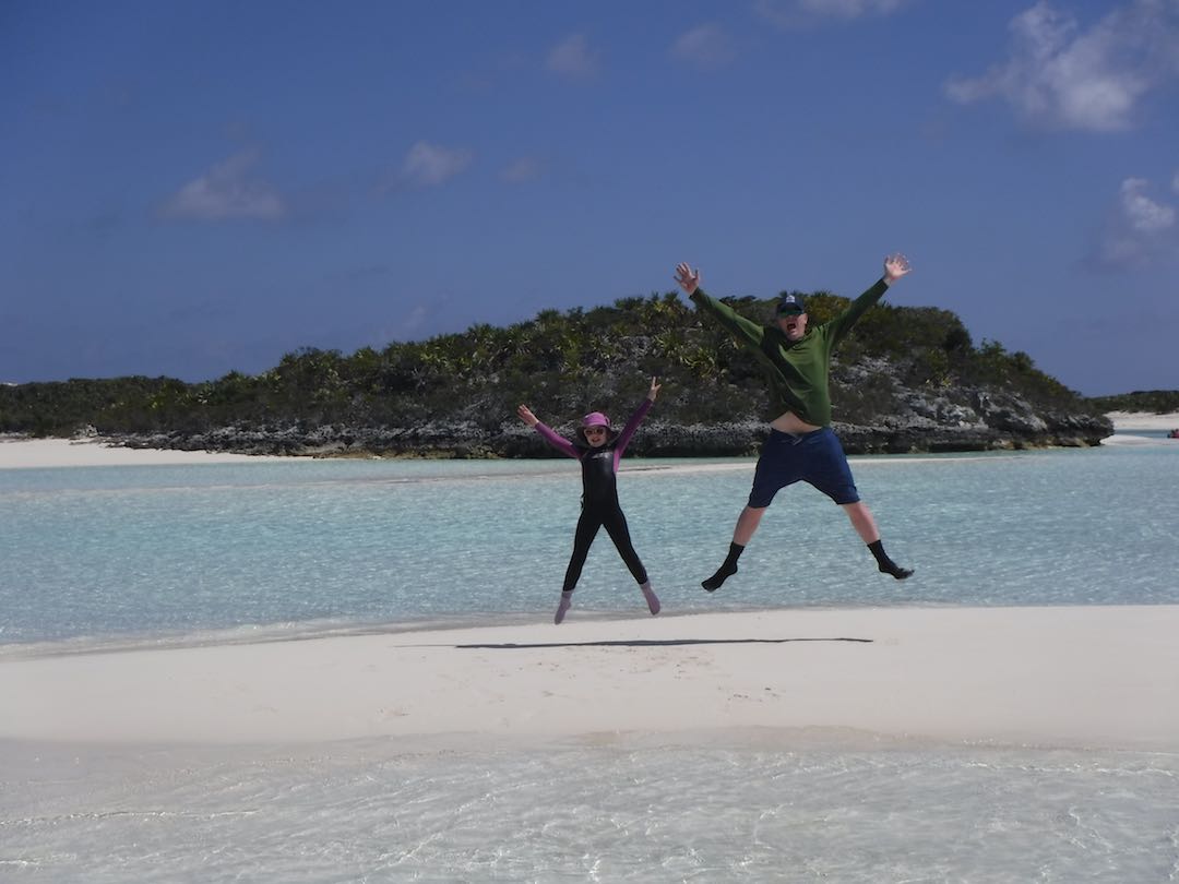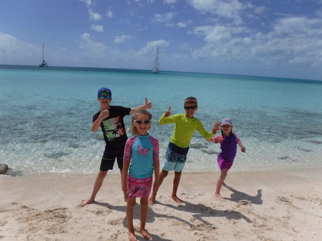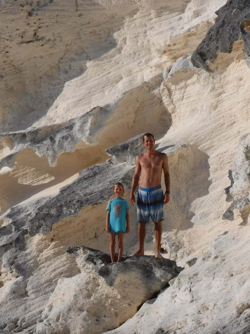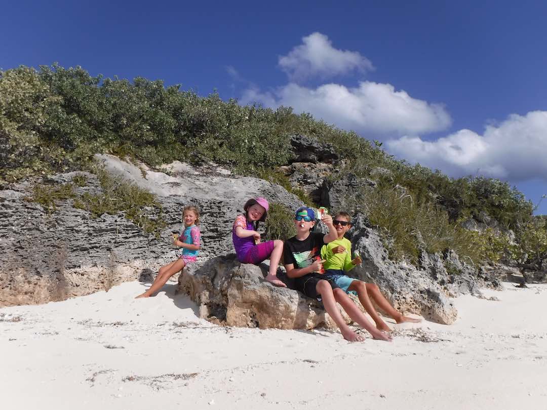 It’s a blur of fun, cousin silliness, endless eating and non stop activity! Yesterday the land crew opted for a sleepover night on Amel so we packed them all up and headed out midmorning for some sailing and exploration in a nearby island called Bitter Guana Cay. Gorgeous white cliffs to explore and climb, iguanas to play with, shells on the beach to discover. It was cooler – in fact – don’t let Greg and Sarah know – but it was the coldest day we’d had since Christmas! When the sun hid behind a cloud it was chilly, but in the sun by the afternoon it felt warm (it was at least 72F). Didn’t stop the fun though.