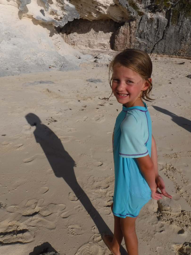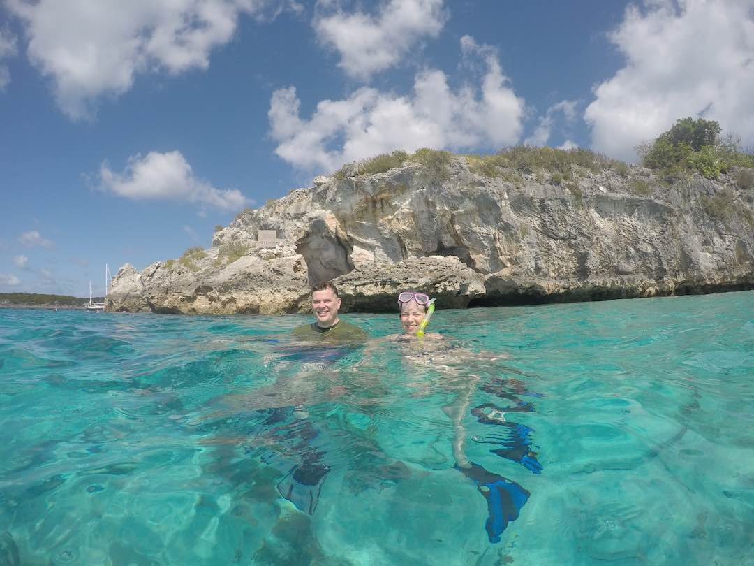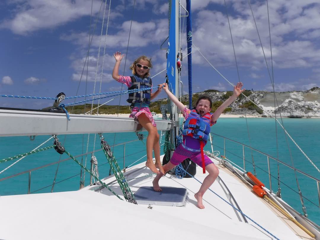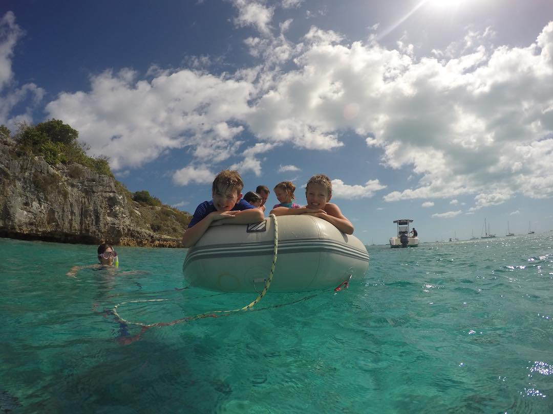 It’s a blur of fun, cousin silliness, endless eating and non stop activity! Yesterday the land crew opted for a sleepover night on Amel so we packed them all up and headed out midmorning for some sailing and exploration in a nearby island called Bitter Guana Cay. Gorgeous white cliffs to explore and climb, iguanas to play with, shells on the beach to discover. It was cooler – in fact – don’t let Greg and Sarah know – but it was the coldest day we’d had since Christmas! When the sun hid behind a cloud it was chilly, but in the sun by the afternoon it felt warm (it was at least 72F). Didn’t stop the fun though.