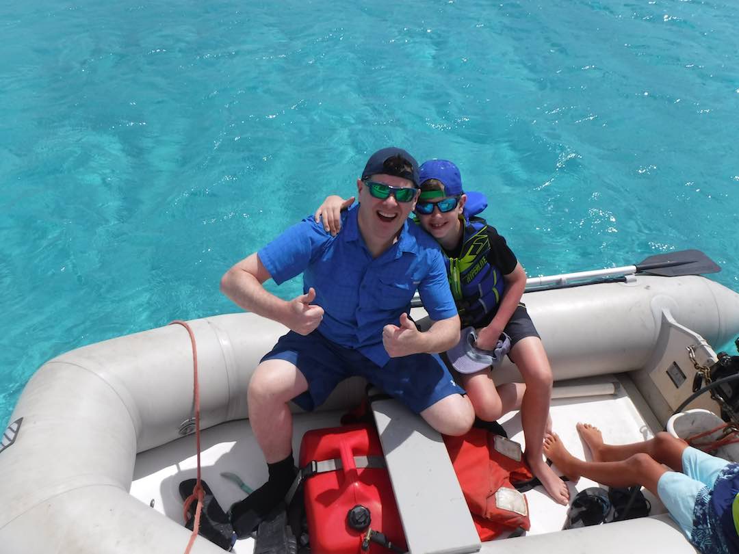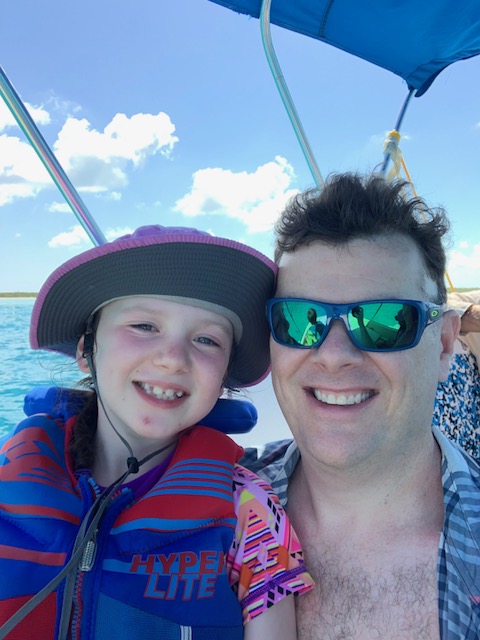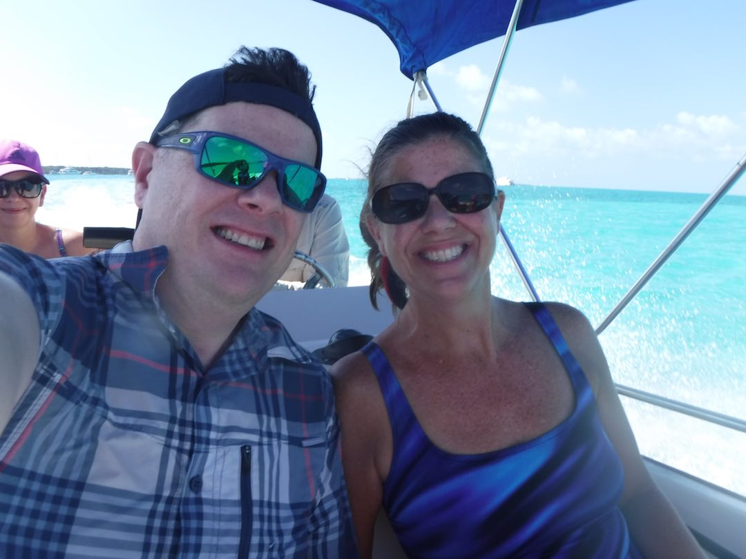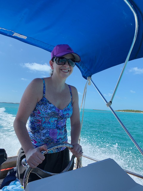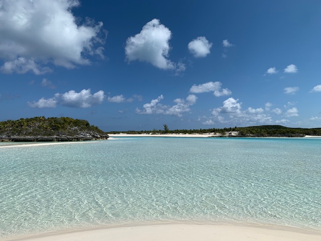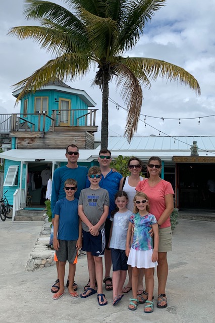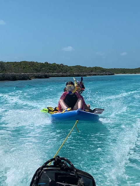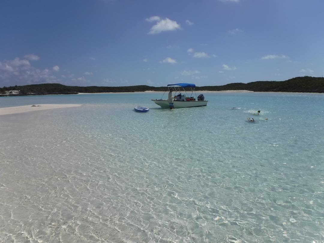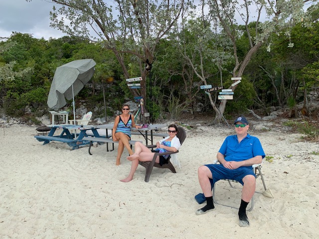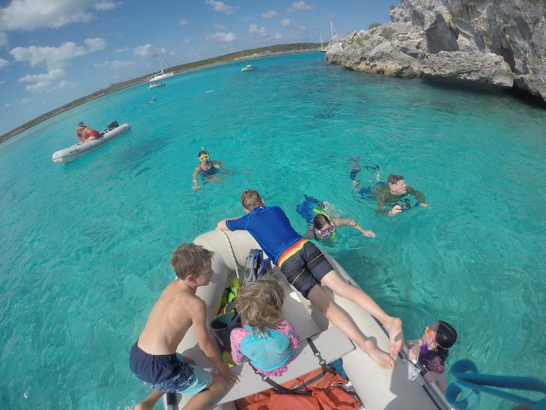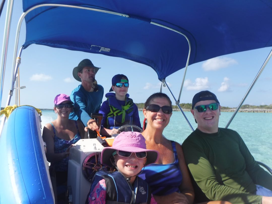 Today was a new speed for us – FAST! Greg and Sarah rented a “go fast” boat, as the kids call them. A 17’ Boston Whaler so we could get out and explore nearby islands in comfort, speed and with shallow depths. Going 25 knots is a new experience when we are used to 6 knots on Amel!! It was so much fun to explore areas between islands that have sand bars, shallow water – places we haven’t been before. We also took them to some of our favourite places like the Sea Aquarium at O’Briens and Rocky Dundas snorkel-caves near Cambridge. Everyone had such a good time. We finished off with a quick early dinner on Amel then sent them back to Staniel at the last light after sunset. There is a big front coming tonite so this morning at 7am we re-positioned Amel from town to north piggy beach so we’ll get better protection. It’s a long way from the other “shore party” at the cottage but hopefully we can move Amel back to town on Thursday.