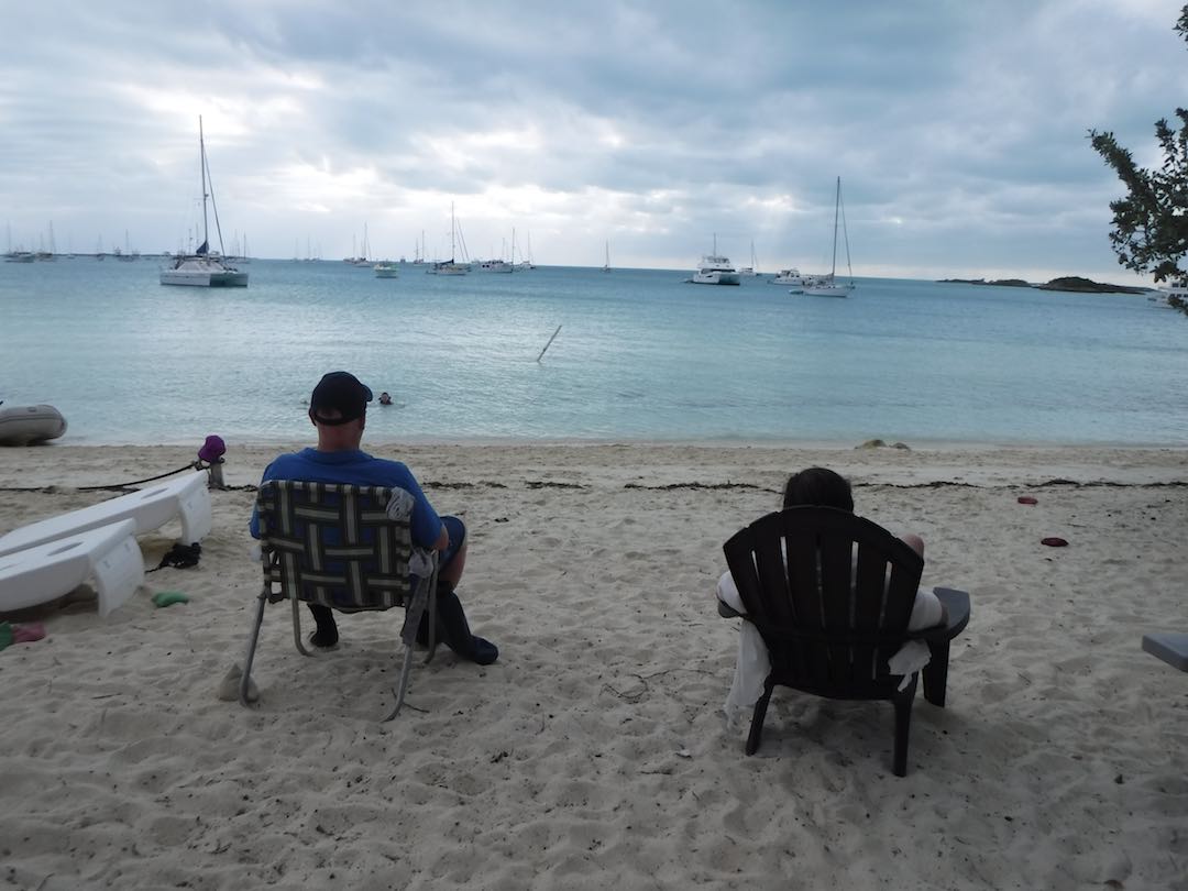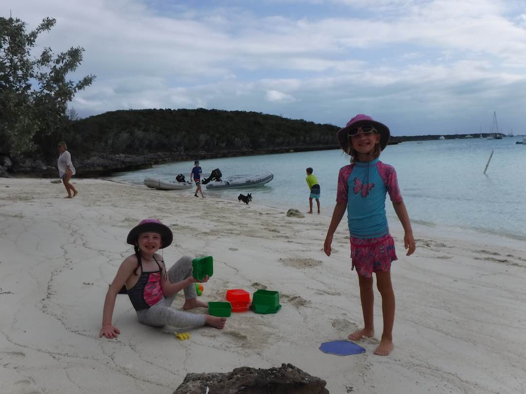 After 2 glorious hot sunny days, we woke to the arrival of a cold front today. Wind slowly strengthened through last night, still sunny in the morning but lots of clouds, then more winds. There were a few scattered squalls around us but we got no rain (poor Amel is still very salty). Overall it was a relatively mild wind event compared to some we’ve had. Everyone enjoyed a low key slow morning then Mike picked up the land dwellers late morning, unfortunately just as heavy clouds arrived, making for a very long, very wet cold dinghy ride. It was totally the right weather to bake a pan of brownies though and eat them hot from the oven!! They were so good there was no time for a photo before the pan was emptied. J During a late afternoon break in the clouds we all ventured out to “pirate beach” so the kids could run around for a bit (after playing card games all day they were ready for some exercise). The girls of course ended up in the water then turned into ice cubes in the wind. The clouds filled in again, the wind kicked up and felt cold, back to Amel and time to return the shore party to the cottage. The kids all agreed that the ocean felt like a nice warm bath tub by comparison to the air. Separate dinners tonite – lucky girls get to go to the Yacht club for dinner! The boys, after deciding it would be fun to jump off the boat, then froze being on deck in the wind, and needed sweaters and hot chocolate to warm up inside! They warmed back up with a chili-and-movie-night on the couch. Mike now has William’s Montreal sniffles and is off to bed early. On the plus side, the stars are even more amazing with the cool dry air. Hoping a good night sleep will be had by all!