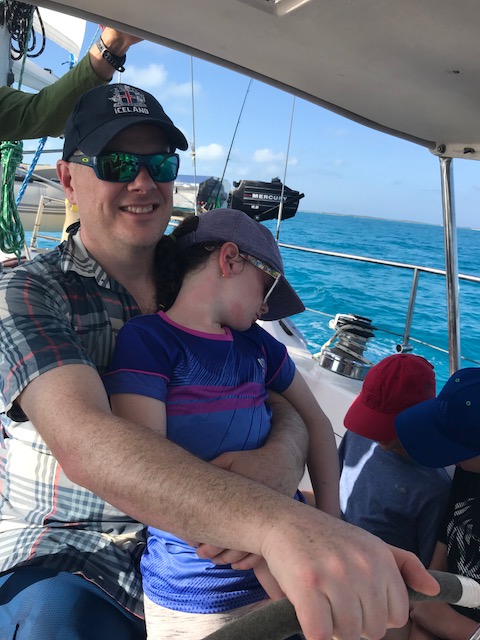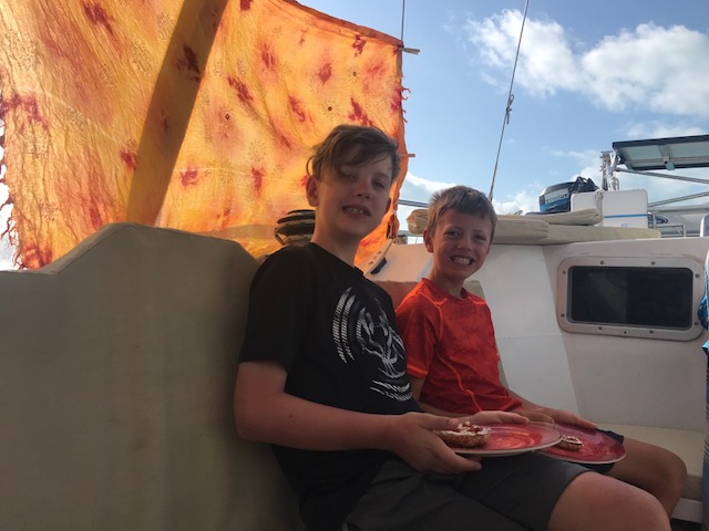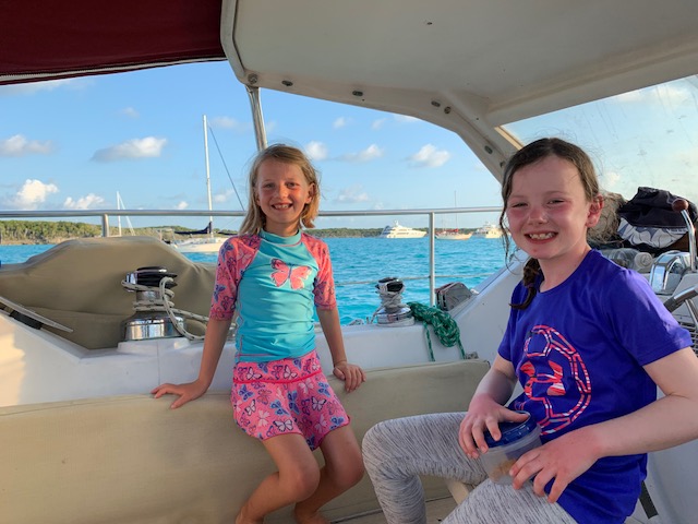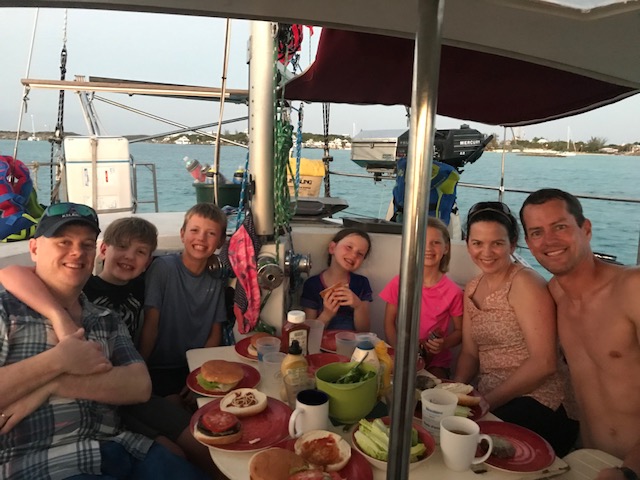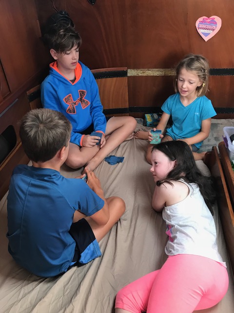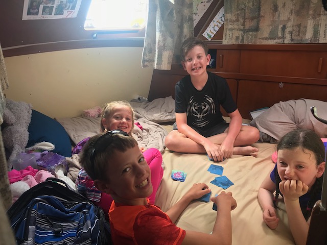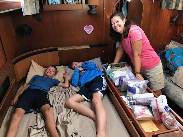 Sleeping last night was a tight squeeze but we made it work. Sarah and girls in the aft cabin, Greg on the salon couch, the boys went to sleep in the VBerth then got moved to the dining room table bed once the adults went to bed so Mike and Tina could sleep in VBerth. Everyone even slept in till 7:30am – a miracle!