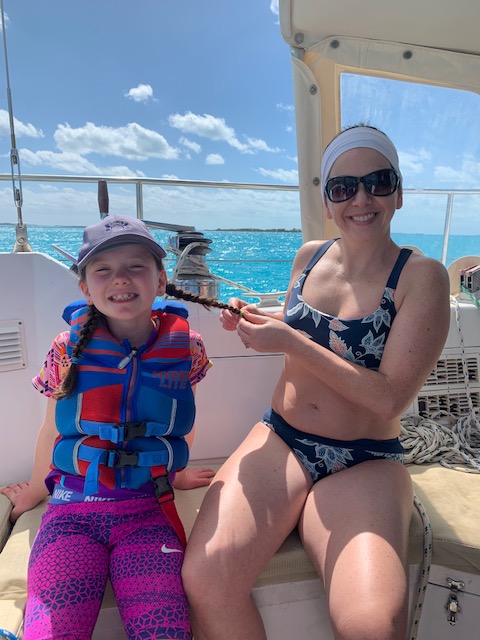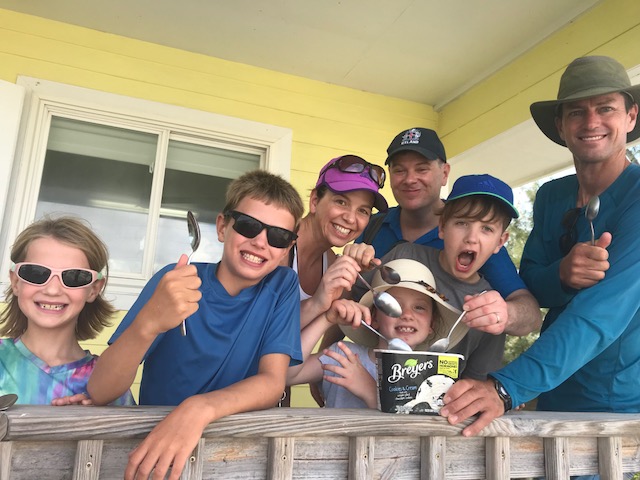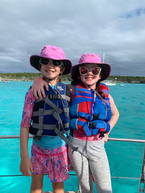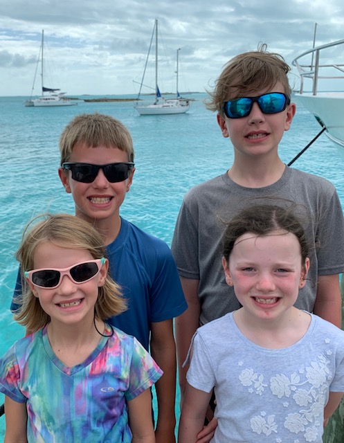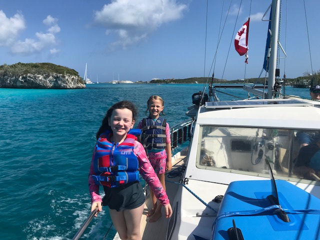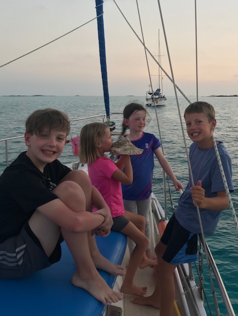 The Canadian cousins have arrived!!!! Let the fun begin! We managed to only get 3 of the 4 burned today….that poor winter skin didn’t have a chance against this hot sunny day! Everyone still smiling. Sailed Amel up to pipe creek for swimming , snorkeling, conch shells then motored back to Staniel for sunset dinner in cockpit. William sleeping with us on boat while Ella and parents enjoy air conditioned cottage on shore. We are jealous…I have sweat oozing from every pore as I contemplate how to fall asleep….!! This is a first!