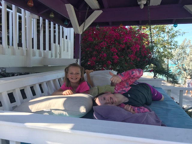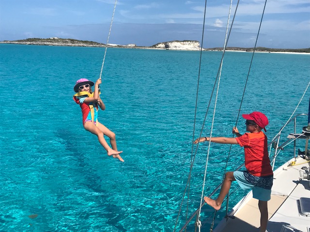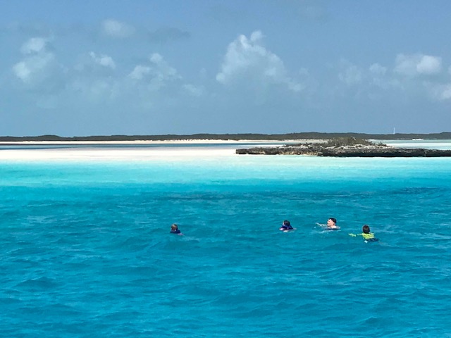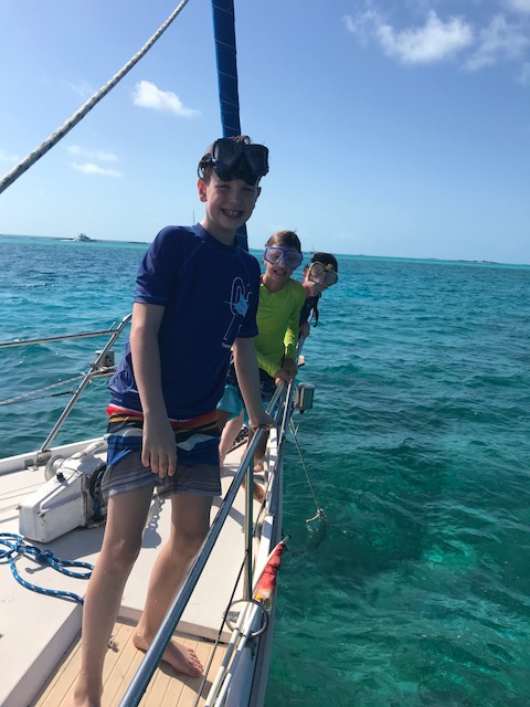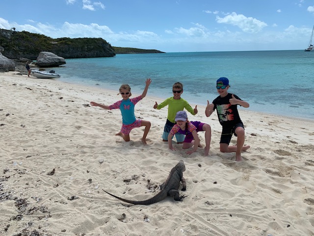 After a day of chores, laundry and hot walking around town, today was a refreshing change. We were “underway” for all of 20mins to move the boat from Black Point a little north to Bitter Guana Cay. Anchored in turquoise water, huge sandy beaches, happy to find good snorkeling , tons of fish, super clear water, iguanas on the beach. We do love the Exumas! Zero boats anchored with us during the day. Weather was calm, hot and sunny, which added to the relaxed atmosphere. No schedule just explored and enjoyed. When not swimming and paddle boarding – kids figured how to the take the “boat swing” to a new level – pushing from the boom and swinging all the way up towards the bow and making it all the way around to the other side of the boom. They love it all!